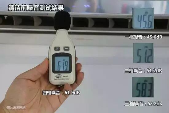 經(jīng)過清潔,空調(diào)的運行噪音有了明顯下降。以最高檔噪音為例,清潔之前4檔噪音為61.9dB,清潔后下降為59.6dB,其它各檔位噪音也均有下降。